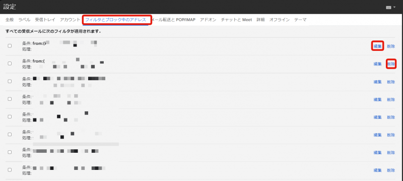 「フィルターとブロック中のアドレス」をクリックして、目的のフィルターを探します。