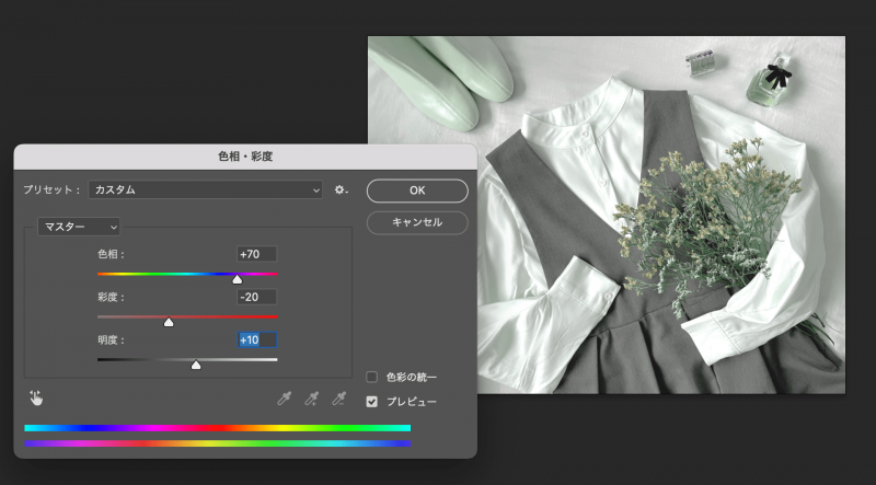 色相は虹色を左右に動かすことで全体的な色のバランスを調整できます。